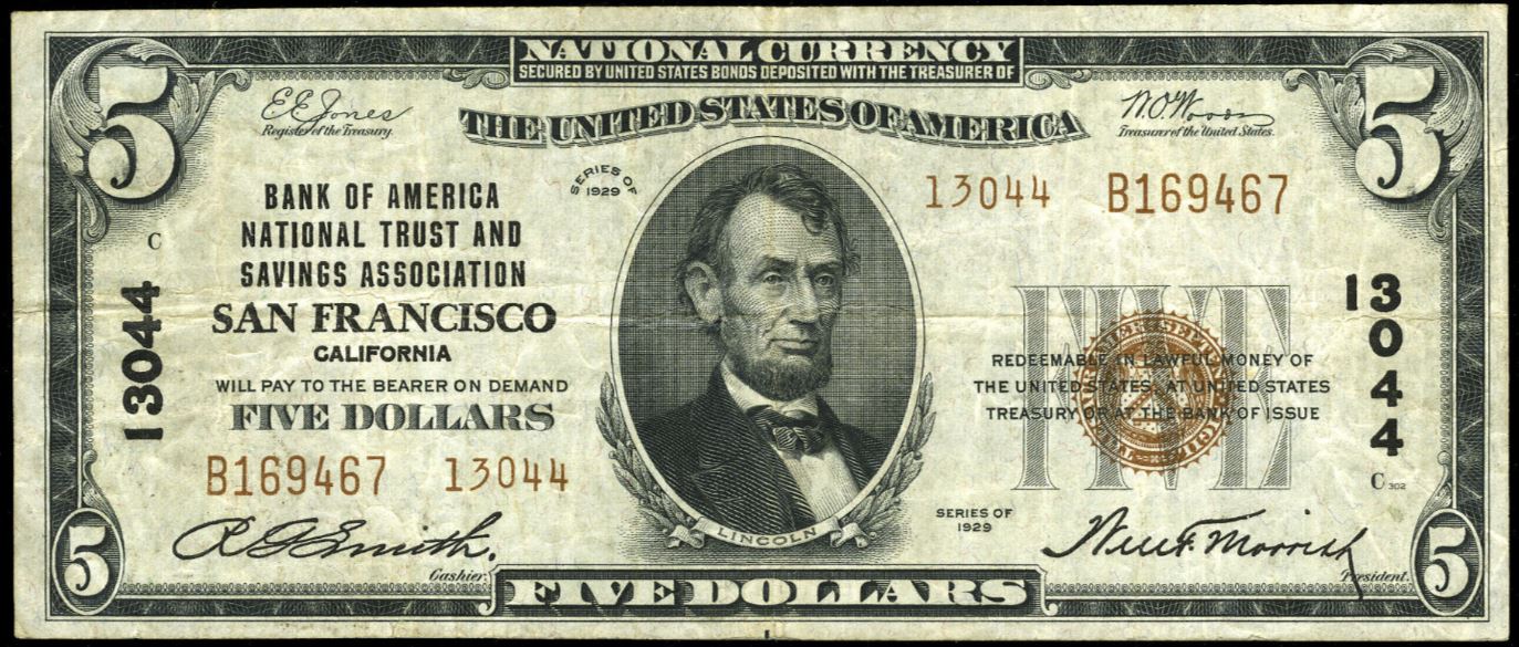 1929 Type 2 $5 San Francisco, CA Ch13044 R.G. Smith, Cashier and William F. Morrish, President. Bank of America National Trust and Savings Association, San Francisco, was the only bank to issue type 2 notes with a B prefix.