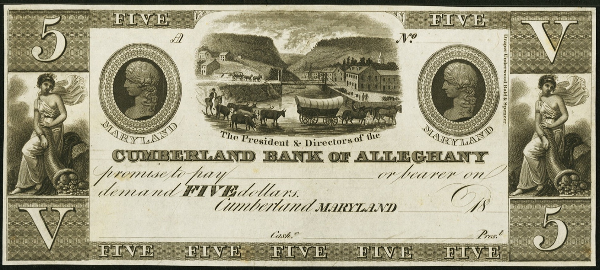 Cumberland Bank of Alleghany $5 obsolete proof, Haxby MD-160. A Draper, Underwood, Bald & Spencer design with the center vignette showing a view of Cumberland. This is flanked on both sides by an oval cameo-like medallion head and a vignette of Prosperity in the end panels MD Ch381