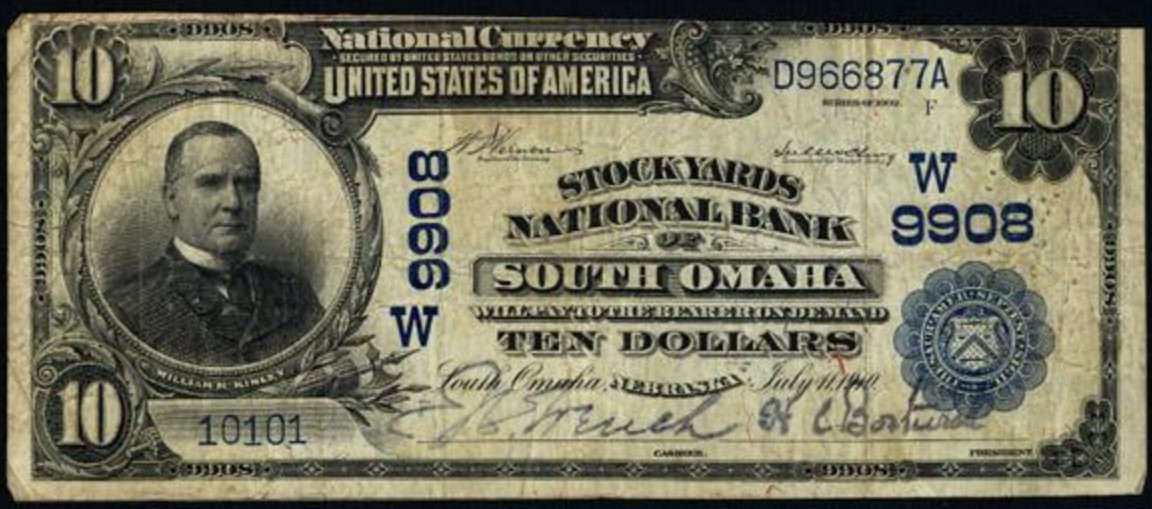 1902 Date Back $10 South Omaha, NE Ch9908 Binary Radar SN 10101 J.C. French, Cashier and H.C. Bostwick, President