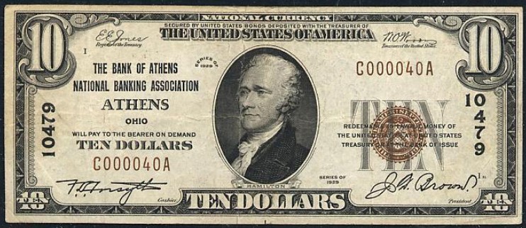 1929 Type 1 $10 bank note with printed signatures of F.D. Forsyth, Cashier and J.D. Brown, President