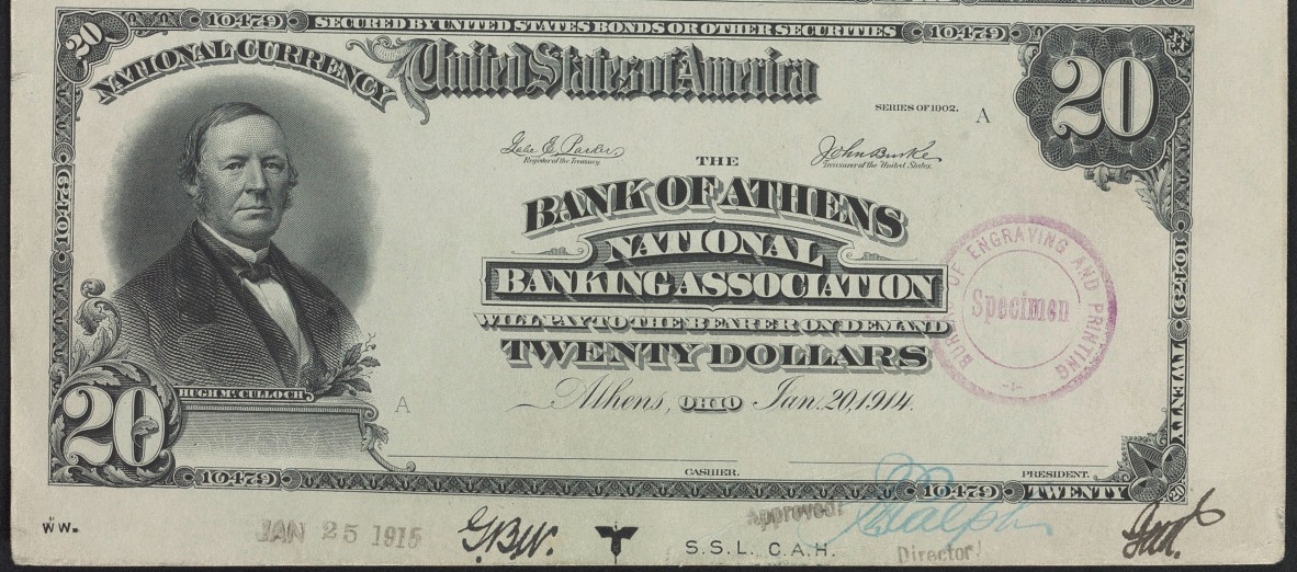 Series of 1902 $20 Date Back proof, Bank of Athens National Banking Association, plate dated Jan. 20, 1914, approved January 25, 1915 Athens, OH Ch10479