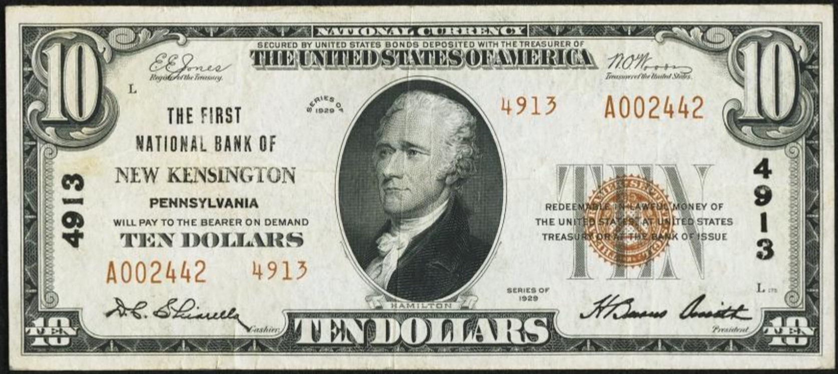 1929 Type 2 $10 New Kensington, PA Ch4913 D.C. Shiarella, Cashier and H. Burns Smith, President