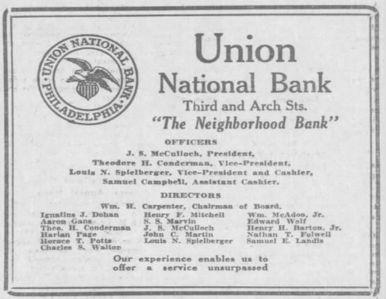 Union National Bank of Philadelphia 1916 advertisement with officers and logo