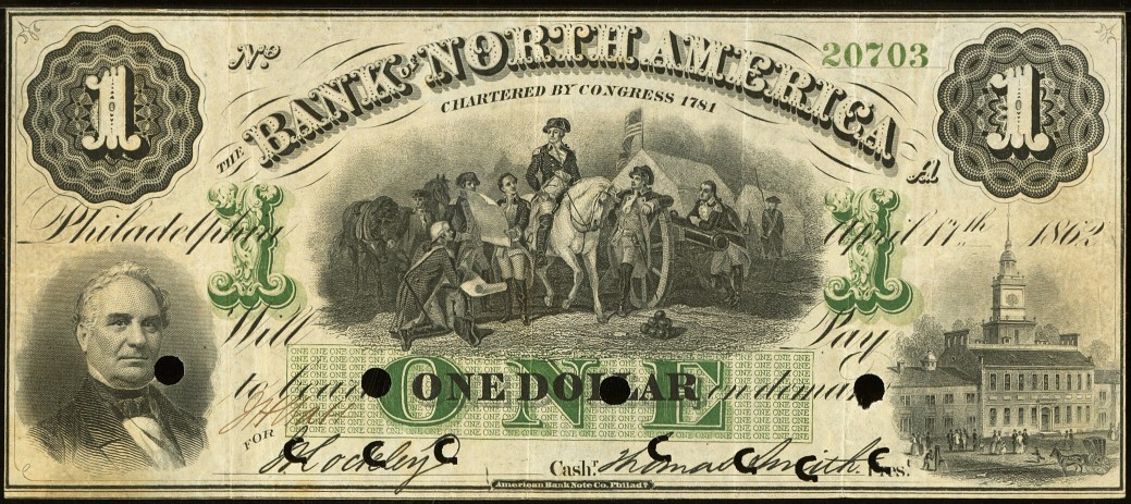 Bank of North America Obsolete $1 dated Apr. 17, 1862, Haxby PA-465. Note features a portrait of John Richardson, president of the bank from 1840-1857, at lower left, as well as vignettes of Washington on horseback in his encampment at Valley Forge at center, and Independence Hall in Philadelphia at right. PA Ch602